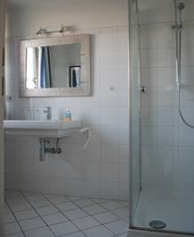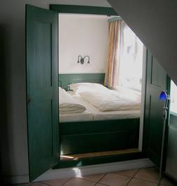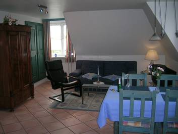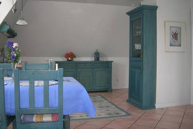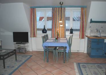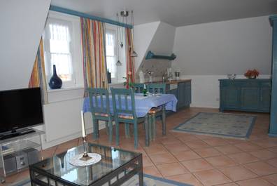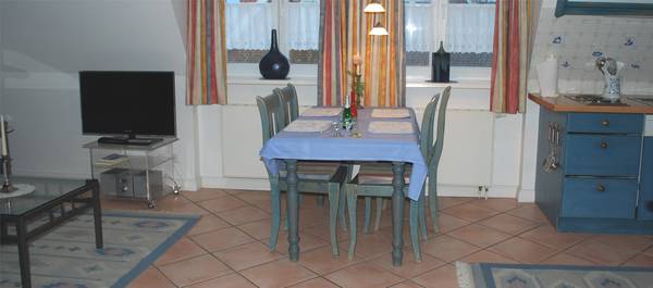 Die Wohnung Uthörn ist sehr stilvoll und hochwertig und mit viel Liebe für das Detail eingerichtet. Neben einem 30 qm großen Wohnraum, einem alkovenähnlichen Schlafraum mit Doppelbett und Außenfenster sowie einem Duschbad (mit Föhn und Außenfenster) verfügt sie über eine integrierte Küchenzeile mit Spülmaschine, Kühlschrank, Kaffeemaschine, Toaster und Handmixer sowie blauweißem Friesenporzellan und formschönen Gläsern. Weitere Details: Sideboard und Vitrine aus massiver blau lasierter Kiefer und antiker Kleiderschrank (Nussbaum). Die hochwertige blaue Schlafcouch im Wohnraum bietet eine zusätzliche Schlafmöglichkeit für 1-2 Personen.
